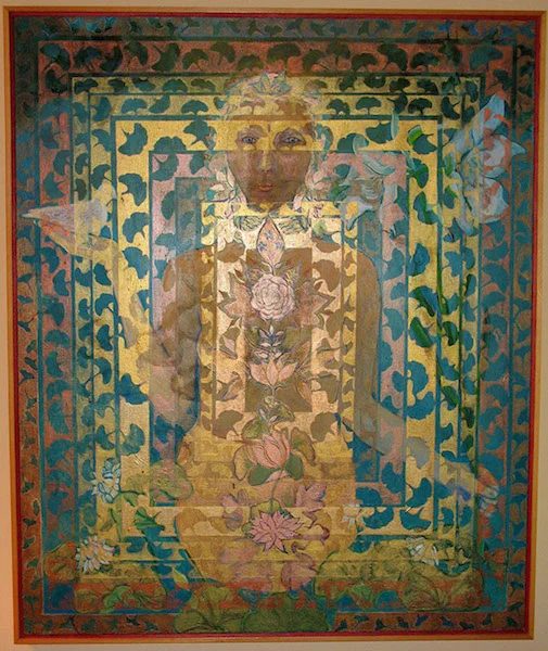 I use a different word for successful . . . satisfied, which is in the eyes of the artist. That’s a big conversation probably . . . but when I feel satisfied with the work is when I no longer feel the need to make changes. Using the piece for the [Stepping Back, Looking Forward] show as an example, I have painted over the canvas so many times, I can’t even count. But one fall, I was doing a lot of walking and picking up leaves and I finally got the notion to connect with nature through leaves. . . . I was also playing with the notion of metallic. . . . Gold is used in [religious] iconography, so in that context it symbolizes something that you hold dear and sacred. . . . My spiritual background is where the metallic idea came from . . . but until I reached that top layer, I was not satisfied. It’s a knowing, and if I don’t have that knowing, I just put it away and keep coming back to it until it feels right, complete.